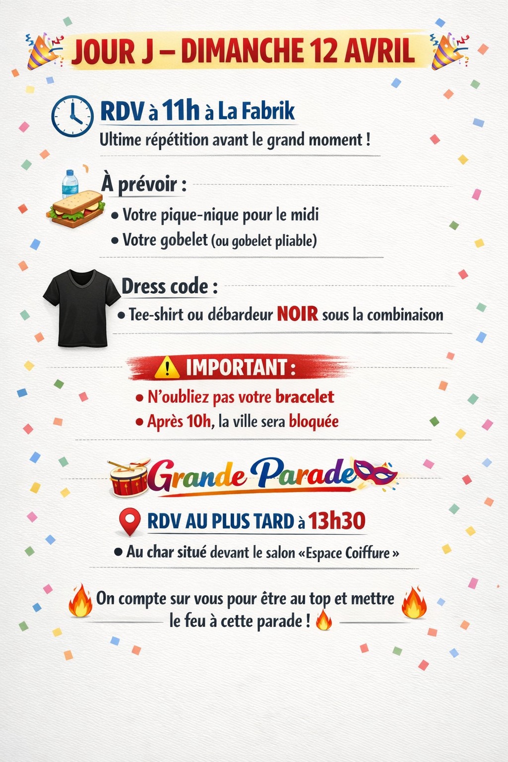 Il sera possible de se déguiser sur place et de laisser ses affaires dans la salle le temps du carnaval. La salle est réservée pour nous et sera fermée à notre départ. Le port du T-shirt ou du débardeur noir vous permettra d'enlever le haut de la combinaison si vous avez trop chaud pendant le défilé. Il n'y a pas de maquillage particulier à prévoir. Le gobelet vous permettra de boire pendant le défilé.