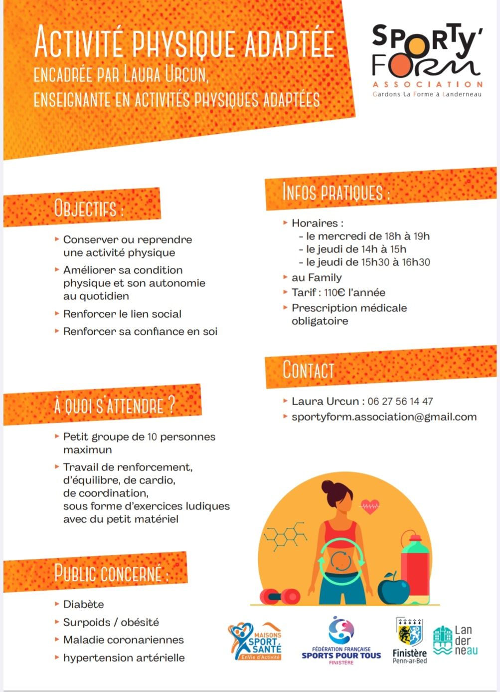Deux nouveaux cours d'Activité Physique Adaptée viennent de s'ouvrir le mercredi de 18h à 19h et le jeudi de 15h30 à 16h30. Ils ont lieu au Family. Il reste de la place.